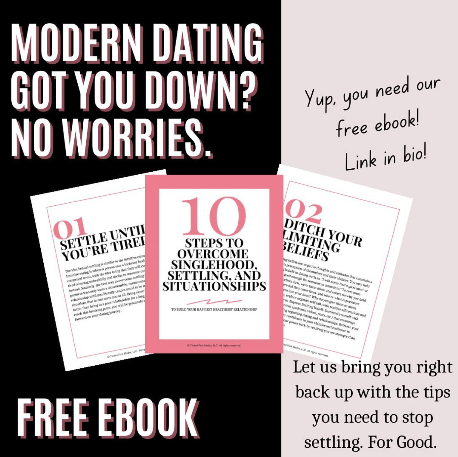 Say bye-bye to settling for less and hello to dating success! Check out our free ebook on the ten steps to overcoming singlehood, settling, and situationships.